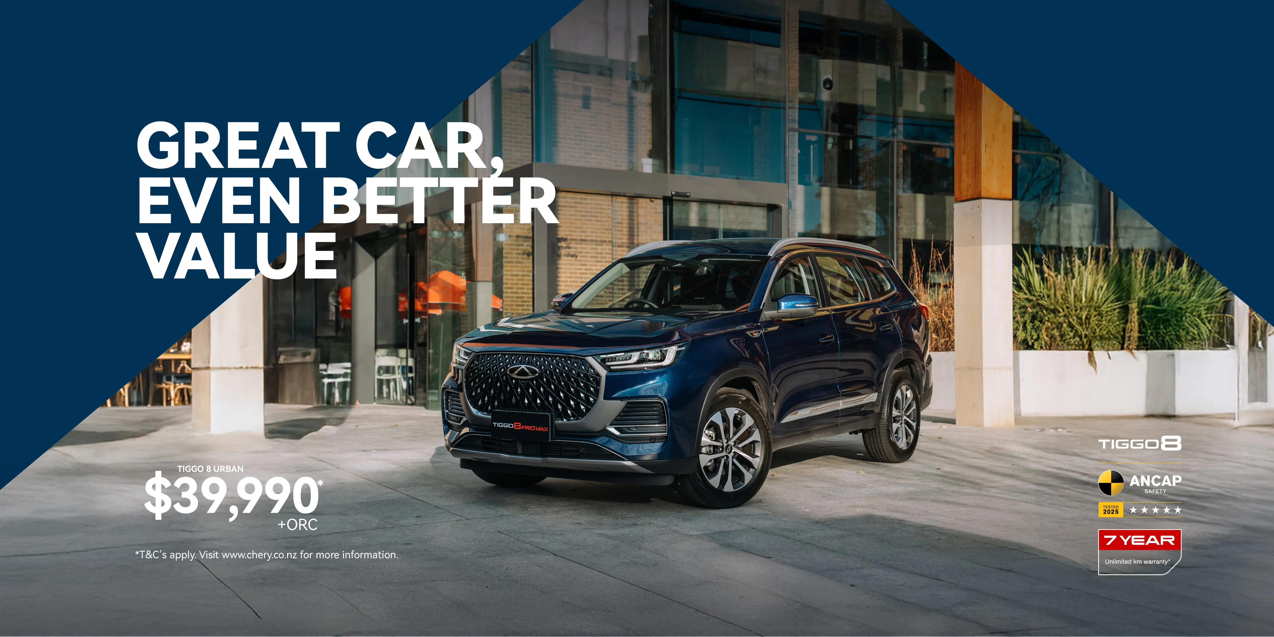 [T5] $39,990 is the manufacturer’s recommended retail pricing (RRP) for the Chery Tiggo 8 Urban without any options. RRP is subject to change without notice, contact your authorised Chery dealer for conformation. All vehicle pricing is inclusive of GST and excludes on road costs (ORC) unless otherwise stated.